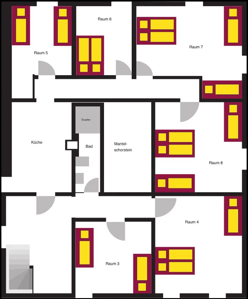 Die Räume 4 und 8 sind Dreibettzimmer und Raum 7 ist ein Vierbettzimmer.